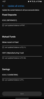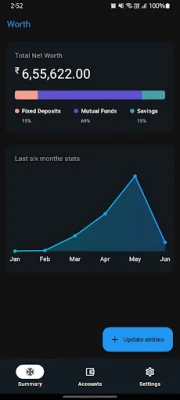 Many might ask - why manual entries? It's because tracking net worth automatically is difficult and error-prone. When you manually enter the total (which won't take more than 2 minutes) the information coming is accurate and based on that many insights can drawn without tracking each and every spend and earning.